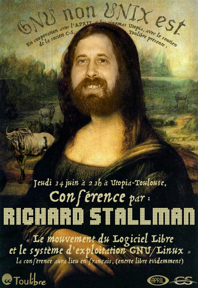 Subvertir une codification revient à la perpétuer : à ce titre, le culte de rms donne lieu à sa propre iconographie — laquelle n’a rien à envier à celle que Barthes observait autour de l’Abbé Pierre en 1953 (il y aurait beaucoup à dire, par exemple, sur la coiffure et la barbe de Stallman, mi-négligées mi-visionnaires). Cependant dans ce cas précis, le culte cède le pas au folklore : si de nombreux Libristes témoignent encore un grand respect à Richard Stallman, pour la plupart (et en particulier les générations ultérieures, celles de Linus Torvalds et de l’open-source sur lesquelles nous reviendrons prochainement) il n’est guère plus qu’un personnage haut-en-couleurs, une sorte de vieil oncle bougon et un peu radoteur que l’on tolère au repas de famille sans vraiment lui prêter attention.
