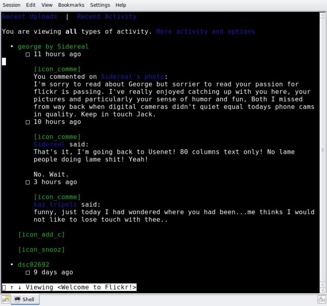 Rappeler également, car on l’oublie trop souvent, la puissance expressive du plain-texte. Je ne reviendrai pas ici sur l’ASCII Art, même si c’est un exemple frappant. Je suis davantage intéressé par la minutie avec laquelle les codeurs (programmeurs ou non) rédigent leur code source, développant de véritables traditions (coding styles) à la fois pratiques et esthétiques dans lesquelles il me semble voir une forme de langage expressif, métalinguistique et poétique — sur laquelle je ne m’attarderai pas davantage ici. Comme toute forme de communication, le plain-texte a subi au fil des décennies une exigence d’expressivité, et certaines traces en sont particulièrement visibles d’un point de vue formel : écrire en capitales signifie que l’on crie, insérer un smiley en fin de phrase dénote un ton ironique, et ainsi de suite.