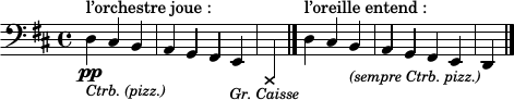 C’est donc, motif essentiel à l’Oumupo et sur lequel nous reviendrons plus bas, qu’il faut compter sur la bonne volonté de l’oreille. De même que l’être humain persiste à voir des objets et des êtres dans la forme des nuages, notre cortex auditif passe son temps à tenter de faire sens des sons auxquels il est exposé — l’on sait ainsi, depuis Chabrier, qu’il est possible de terminer une gamme descendante en pizz. de contrebasse, par un coup de grosse caisse :