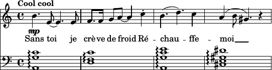 La partie de piano est ici rédigée, une fois n’est pas coutume, à la truelle. Par "truelle" j’entends le \chordmode de LilyPond, qui fabrique automatiquement des accords parfaits majeurs. C’est ici délibéré : la partie de piano n’emploie que des accords majeurs — en cela elle est exactement à l’opposé du maki mococo, lequel s’appuyait sur des accords mineurs (quoiqu’avec des enrichissements modaux, ici totalement absents).