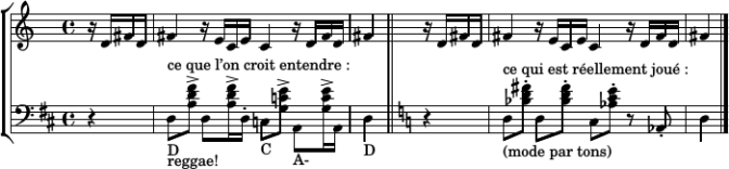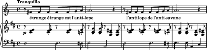 Les hauteurs sont choisies de façon à pouvoir s’adapter aussi bien (c’est-à-dire aussi mal) à un contexte en Ré mineur qu’en Mi bémol mineur — moyennant parfois un peu de ce que je nommais plus haut la "bonne volonté de l’oreille". Enfin, l’écriture rythmique met en avant des anticipations et contretemps, pour tenter de compenser l’austérité du langage employé par un aspect très syncopé et dansé. Le rythme se calme sur la dernière strophe, avec un phrasé plus legato.