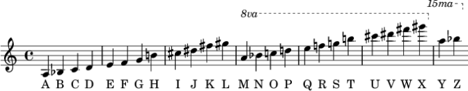 Une question se pose donc : faut-il respecter l’octave des notes-lettres, ou bien peut-on les combiner à n’importe quelle octave et dans n’importe quel sens ? Dans la mesure du possible, j’ai essayé de préserver les sauts d’octaves et de double-octave ; c’est à peu près le même procédé que j’avais utilisé en 2002 dans ma pièce pour deux pianos. Étant donné le contexte du concours, je tenais à indiquer (discrètement quoiqu’ostensiblement) qu’il s’agissait d’une écriture sous contraintes ; c’est pourquoi j’ai "dénoncé le code" à quelques endroits, en indiquant (grâce à LilyPond) les lettres dans les notes correspondantes (la plupart des mots, y compris ceux qui ne viennent pas du texte de Roubaud, demeurent cachés).