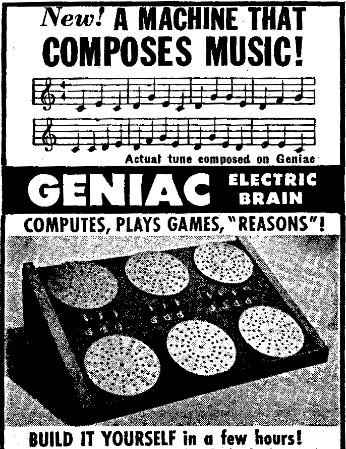 Et de fait, les premiers pas de la composition algorithmique semblent avoir été constitués par l’analyse statistique de musiques existantes. Je découvre à l’instant une réclame de 1956, glorieusement intitulée Une machine qui compose de la musique :