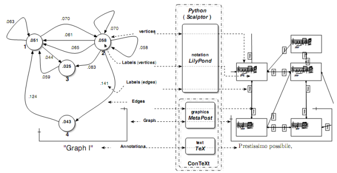 –Andrea Valle a développé un système algorithmique complexe qui intègre (dans des modules Python ?) LilyPond, SuperCollider, TeX et autres,