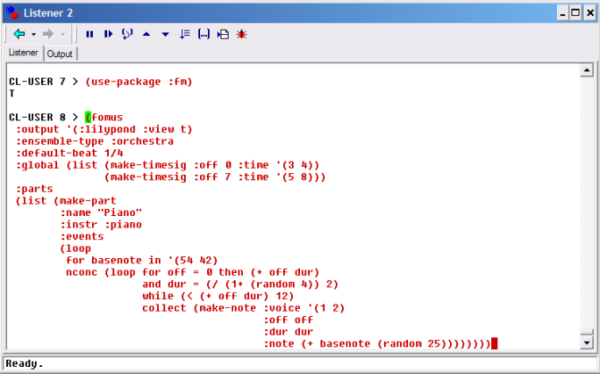 Cependant, Solfege aussi bien que LilyPond ne conviennent qu’à des règles de composition relativement simples. Comme l’a remarqué Jaime, "Je pense qu’une chose pour laquelle LilyPond n’est pas fait est d’accomplir des opérations algorithmiques sur du matériau musical, à part les opérations habituelles de transposition, de transformation rythmique, etc.