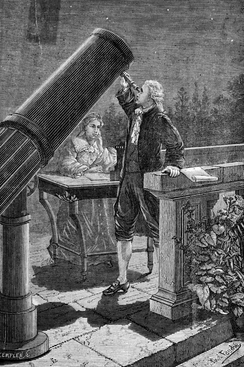 William Herschel (1738-1822) voit le jour dans le principat de Hanovre, à une époque où l’Allemagne n’existe pas encore en tant qu’entité. C’est un enfant éveillé et curieux de tout ; ainsi, prenant des leçons de français (ainsi que d’anglais et de latin) avec son grand frère Jacob, il termine le programme entier alors que son frère n’en est encore qu’à la moitié… mais William insiste pour continuer à assister aux leçons afin de grappiller auprès de leur précepteur davantage de connaissances, car ce dernier est fort cultivé en mathématiques et en philosophie.