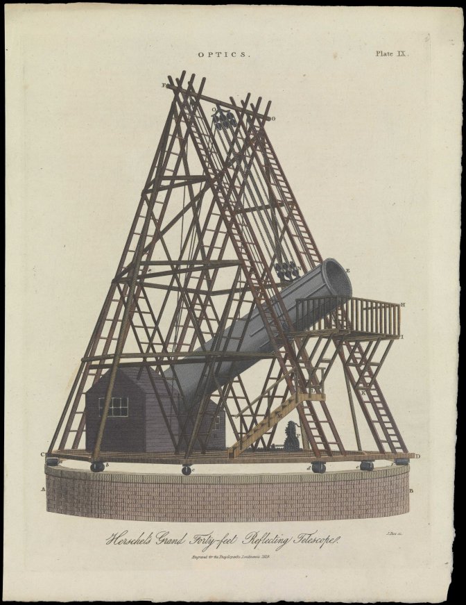 (La première subvention royale permet aux Herschel de quitter Bath pour s’installer à Datchet, dans une propriété pourvue d’un grand jardin où William fait construire un télescope de 6 mètres. En 1785, il obtient des fonds supplémentaires pour édifier à Slough un télescope deux fois plus grand, dont la construction prendra quatre ans. Immense pour l’époque — il est alors le plus grand au monde, et le restera pendant plus de cinquante ans —, il restera un édifice marquant pour l’Angleterre et pour l’Europe entière, même si les observations en résultant s’avéreront quelque peu insatisfaisantes — Herschel lui-même continuant d’utiliser plus volontiers le précédent.)