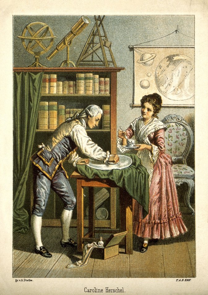 Caroline Herschel (1750-1848) est la huitième enfant de la famille Herschel à Hanovre, et la seule fille à avoir survécu (exceptée l’aînée Sophia, bien plus âgée et mariée très tôt). Son père, vieillissant et malade, tente de lui transmettre les mêmes connaissances qu’à ses fils, mais contrairement à ces derniers elle se voit quotidiennement attribuer de nombreuses corvées ménagères, ne lui laissant que peu de temps (tout au plus son père l’éduque-t-il en catimini lorsque sa mère est absente). Ayant survécu de justesse à la variole à l’âge de quatre ans, puis au typhus à dix ans, elle se retrouve aveugle d’un œil et ne grandissant pas au-delà d’un mètre trente. N’ayant aucun espoir de la marier, sa mère la réduit pour ainsi dire en esclavage, lui interdisant même de chercher une place de domestique hors du domicile familial.